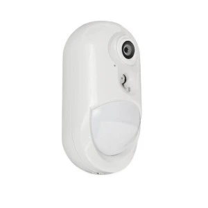 Bezprzewodowa czujka ruchu PIR z komunikacją dwukierunkową PowerG i kamerą, przeznaczona do montażu wewnątrz pomieszczeń.