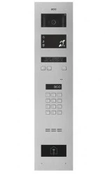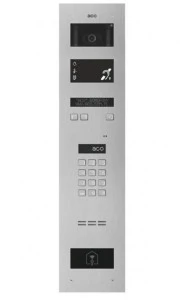Panel cyfrowy Inspiro slave z zamkiem szyfrowym zgodnym z alfabetem Braille'a, kamerą kolorową, dodatkową sygnalizacją optyczną, pętlą indukcyjną T dla osób niedosłyszących, komuniukatami głosowymi, czytnikiem zbliżeniowym oraz elektronicznym spisem lokatorów, stal nierdzewna