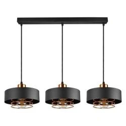 CHIRO to lampa wisząca przystosowana na 3 żarówki z gwintem E27 o maksymalnej mocy świecenia 60W każda (brak w zestawie). Zastosowanie wymiennego źródła światła pozwala każdemu użytkownikowi na indywidualny dobór rodzaju żarówki i na dostosowanie jej kształtu oraz barwy światła do własnych preferencji. Lampa utrzymana jest w stylu loftowym i doskonale wkomponuje się w pomieszczenia surowe i minimalistyczne, w których dominują cegła, beton i metal. CHIRO to prawdziwa ozdoba sufitu o kształcie przyciągającym wzrok. Klosze mają formę cylindryczną, a żarówki otoczone są dekoracyjnymi elementami w kolorze miedzi, które dodatkowo zabezpieczają zamontowane źródła światła. Wszystkie klosze umieszczone są na wspólnej listwie. Taka lampa doskonale oświetli i ozdobi przestrzeń np. nad stołem w jadalni. Elementy lampy wykonane są z metalu malowanego proszkowo na kolor czarny. Produkt nadaje się do montażu sufitowego, natynkowego. Długość całkowita lampy wynosi 70 cm.