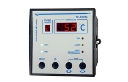 ?R-100M to regulator temperatury który służy do zabezpieczenia temperaturowego suchych transformatorów, poprzez pomiar i kontrolę temperatury z czterech czujników podłączonych w układzie 2 lub 3 przewodowym oraz wyświetlania odczytów na wyświetlaczu i podania sygnałów alarmowych wysyłanych po RS-485 przypadku przekroczenia zakresu któregoś z parametrów.