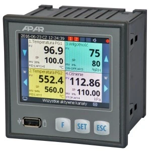 regulacja, nadzór i rejestracja temperatury oraz innych wielkości fizycznych (wilgotność, ciśnienie, poziom, przepływ, prędkość, itp.) przetworzonych na standardowy sygnał elektryczny (0/4÷20mA, 0÷10V, 0÷60mV, 0÷850Ω), możliwość prezentacji od 1 do 4 kanałów