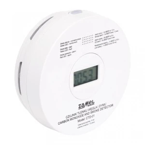ZAMEL CTD-01 to czujnik 2-w-1, który nieprzerwanie wykrywa tlenek węgla i dym, alarmując głośnym sygnałem 85 dB oraz migającą diodą; ma czytelny wyświetlacz LCD, minimalny próg detekcji CO 30 ppm i przycisk test/wyciszenie.