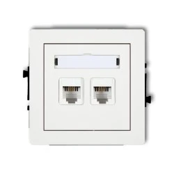 Podwójne gniazdo telefoniczne DECO przeznaczone do instalacji podtynkowych; wyposażone w dwa złącza RJ11 (4 styki) i rozwiązanie beznarzędziowego podłączania przewodów, stosowane w instalacjach telekomunikacyjnych wewnątrz budynków.