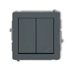 Łącznik jednobiegunowy ze schodowym (osobne zasilanie) z serii DECO, wykończony powłoką grafit mat, przeznaczony do sterowania jednym obwodem oświetleniowym i współpracy w układach schodowych z oddzielnym zasilaniem funkcji schodowej.