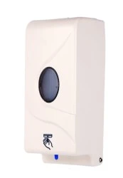 Automatyczny dozownik do mydła w płynie i żelu do dezynfekcji o pojemności 0,80 l. Obudowa wykonana z trwałego plastiku, wyposażona w zamek i wizjer do kontroli zawartości. Zasilanie: 6 baterii AA/LR6 o napięciu 1,5 V. Zasięg czujnika do 10 cm.