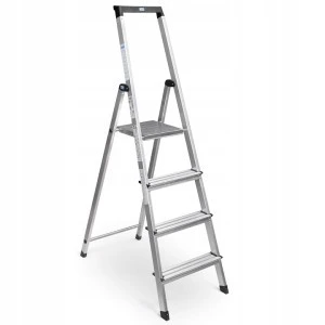 Zaprojektowano ją z myślą o gospodarstwach domowych, biurach i małych warsztatach. Duży podest z zintegrowaną półką i szerokie stopnie gwarantują wygodną i bezpieczną pracę. Każdy majsterkowicz oraz pani domu będą z tej drabiny zadowoleni, a prace staną się czystą przyjemnością. Spełnia normy EN-131 przez co bez przeszkód można jej używać również w zakładach pracy.