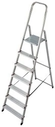 Drabina aluminiowa ze stopniami, pałąkiem i dużą antypoślizgową platformą.