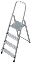 Drabina aluminiowa ze stopniami, pałąkiem i dużą antypoślizgową platformą.