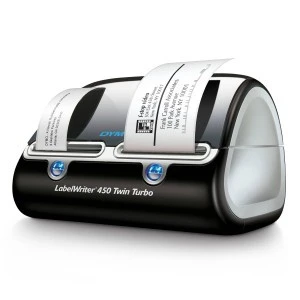Drukarka etykiet LabelWriter 450 Twin Turbo mieści dwie rolki z etykietami, można wiec drukować etykiety adresowe i wysyłkowe jeszcze szybciej.