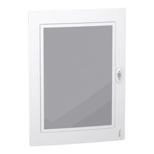 Przezroczyste drzwi do obudowy PrismaSeT XS. Zaprojektowane, aby były zgodne z obudową z 4 rzędami 24 modułów 18 mm. Stopień ochrony IP to IP40. Drzwi składają się z krawędzi stalowej z bezbarwnym szkłem. Kolor krawędzi jest biały (RAL 9003). Przeznaczone do nowych i modernizowanych instalacji w budynkach mieszkaniowych jak i małych komercyjnych. Drzwi mogą być zamontowane na obudowie podtynkowej lub natynkowej. Można je zamontować i otworzyć po prawej lub lewej stronie obudowy. Należy podać numer identyfikacyjny klucza blokującego. Całkowite wymiary to (szer.) 550mm x (wys.) 750mm x (gł.) 20mm. Waga: 6,910kg. Stopień ochrony IK to IK09. Temperatura pracy wynosi od -25°C do 60°C.