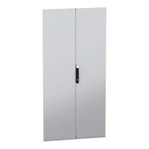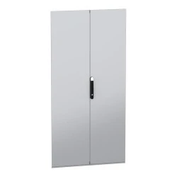Stalowe, podwójne drzwi przeznaczone do montażu w wolnostojącej, modułowej obudowie PanelSeT SFN ze stali zdekarbonizowanej do różnych zastosowań. Kompatybilne ze stalową, wolonstojącą obudową Spacial SM. Ich nominalna wysokość i szerokość wynoszą odpowiednio 2000 mm i 1000 mm. Drzwi wykonane są z blachy stalowej, a uchwyt z poliamidu 6 z dodatkiem 30% włókna szklanego. Epoksydowo-poliestrowa powłoka proszkowa zapewnia gładki wygląd. Są w kolorze szarym (RAL 7035) z czarnym (RAL 9005) uchwytem. Stopień otwarcia drzwi wynoszą do 120 stopni. Główne drzwi są wyposażone w czteropunktowy zamek z klamką, który ma 5 mm wkładkę z podwójnym prętem dla bezpieczeństwa, podczas gdy drugie drzwi mają system blokujący z klamką. Ten produkt jest oznaczony ekologicznym znakiem Green Premium, co świadczy o minimalnym zużyciu substancji niebezpiecznych.