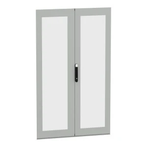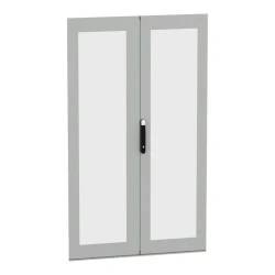 Przeszklone, podwójne drzwi przeznaczone do montażu w wolnostojącej, modułowej obudowie PanelSeT SFN ze stali zdekarbonizowanej do różnych zastosowań. Kompatybilne ze stalową, wolonstojącą obudową Spacial SM. Ich nominalna wysokość i szerokość wynosi odpowiednio 2000 mm i 600 mm. Drzwi wykonane są z blachy stalowej i szkła Securit, a uchwyt z poliamidu 6 z dodatkiem 30% włókna szklanego. Epoksydowo-poliestrowa powłoka proszkowa zapewnia gładki wygląd. Są w kolorze szarym (RAL 7035) z czarnym (RAL 9005) uchwytem. Stopień otwarcia drzwi wynosi do 120 stopni. Główne drzwi są wyposażone w czteropunktowy zamek z klamką, który ma 5 mm wkładkę z podwójnym prętem dla bezpieczeństwa, podczas gdy drugie drzwi mają system blokujący z klamką. Ten produkt jest oznaczony ekologicznym znakiem Green Premium, co świadczy o minimalnym zużyciu substancji niebezpiecznych.