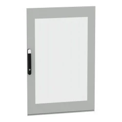 Przeszklone drzwi przeznaczone do montażu w wolnostojącej, modułowej obudowie PanelSeT SFN ze stali zdekarbonizowanej do różnych zastosowań. Ich nominalna wysokość i szerokość wynoszą odpowiednio 1200 mm i 800 mm. Drzwi wykonane są z blachy stalowej i szkła Securit, a uchwyt z poliamidu 6 z dodatkiem 30% włókna szklanego. Epoksydowo-poliestrowa powłoka proszkowa zapewnia gładki wygląd. Są w kolorze szarym (RAL 7035) z czarnym (RAL 9005) uchwytem. Stopień otwarcia drzwi wynosi do 120 stopni, co oznacza, że mogą być otwierane z dowolnej strony. Drzwi są wyposażone w czteropunktowy zamek z klamką, który ma 5 mm wkładkę z podwójnym prętem dla bezpieczeństwa. Ten produkt jest oznaczony ekologicznym znakiem Green Premium, co świadczy o minimalnym zużyciu substancji niebezpiecznych.