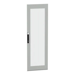 Przeszklone drzwi przeznaczone do montażu w wolnostojącej, modułowej obudowie PanelSeT SFN ze stali zdekarbonizowanej do różnych zastosowań. Kompatybilne ze stalową, wolonstojącą obudową Spacial SM. Ich nominalna wysokość i szerokość wynosi odpowiednio 2000 mm i 1000 mm. Drzwi wykonane są z blachy stalowej i szkła Securit, a uchwyt z poliamidu 6 z dodatkiem 30% włókna szklanego. Epoksydowo-poliestrowa powłoka proszkowa zapewnia gładki wygląd. Są w kolorze szarym (RAL 7035) z czarnym (RAL 9005) uchwytem. Stopień otwarcia drzwi wynosi do 120 stopni, co oznacza, że mogą być otwierane z dowolnej strony. Drzwi są wyposażone w czteropunktowy zamek z klamką, który ma 5 mm wkładkę z podwójnym prętem dla bezpieczeństwa. Ten produkt jest oznaczony ekologicznym znakiem Green Premium, co świadczy o minimalnym zużyciu substancji niebezpiecznych.