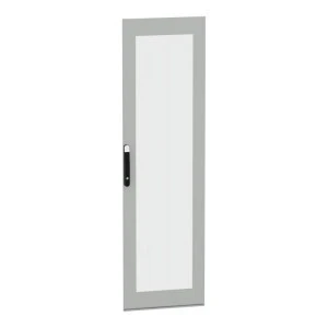 Przeszklone drzwi przeznaczone do montażu w wolnostojącej, modułowej obudowie PanelSeT SFN ze stali zdekarbonizowanej do różnych zastosowań. Kompatybilne ze stalową, wolonstojącą obudową Spacial SM. Ich nominalna wysokość i szerokość wynosi odpowiednio 2200 mm i 1000 mm. Drzwi wykonane są z blachy stalowej i szkła Securit, a uchwyt z poliamidu 6 z dodatkiem 30% włókna szklanego. Epoksydowo-poliestrowa powłoka proszkowa zapewnia gładki wygląd. Są w kolorze szarym (RAL 7035) z czarnym (RAL 9005) uchwytem. Stopień otwarcia drzwi wynosi do 120 stopni, co oznacza, że mogą być otwierane z dowolnej strony. Drzwi są wyposażone w czteropunktowy zamek z klamką, który ma 5 mm wkładkę z podwójnym prętem dla bezpieczeństwa. Ten produkt jest oznaczony ekologicznym znakiem Green Premium, co świadczy o minimalnym zużyciu substancji niebezpiecznych.