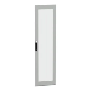 Przeszklone drzwi przeznaczone do montażu w wolnostojącej, modułowej obudowie PanelSeT SFN ze stali zdekarbonizowanej do różnych zastosowań. Kompatybilne ze stalową, wolonstojącą obudową Spacial SM. Ich nominalna wysokość i szerokość wynoszą odpowiednio 2200 mm i 600 mm. Drzwi wykonane są z blachy stalowej i szkła Securit, a uchwyt z poliamidu 6 z dodatkiem 30% włókna szklanego. Epoksydowo-poliestrowa powłoka proszkowa zapewnia gładki wygląd. Są w kolorze szarym (RAL 7035) z czarnym (RAL 9005) uchwytem. Stopień otwarcia drzwi wynosi do 120 stopni, co oznacza, że mogą być otwierane z dowolnej strony. Drzwi są wyposażone w czteropunktowy zamek z klamką, który ma 5 mm wkładkę z podwójnym prętem dla bezpieczeństwa. Ten produkt jest oznaczony ekologicznym znakiem Green Premium, co świadczy o minimalnym zużyciu substancji niebezpiecznych.