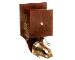 Dzwonek elektromechaniczny,obudowa z bejcowanego drewna (kolor ciemne drewno),mosiężna czasza (fi 52 mm),replika z 1920,możliwość regulacji siły głosu,poziom dźwięku: ok. 88 dB (230 V AC)
