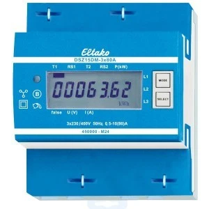 Licznik prądu trójfazowego M-Bus. Prąd maksymalny 3x80A, strata w trybie czuwania tylko 0,5 W na ścieżkę. Urządzenie do montażu szeregowego na szynie DIN-EN 60715 TH35. 4 jednostki podziału = 70 mm szerokości, 58 mm głębokości. Klasa dokładności B (1%). Z interfejsem M-Bus. Licznik prądu trójfazowego z bezpośrednim pomiarem mierzy energię czynną na podstawie prądów płynących między wejściami i wyjściami. Zużycie własne wynoszące maksymalnie 0,5 W mocy czynnej na ścieżkę nie jest mierzone ani wyświetlane. Można podłączyć 1, 2 lub 3 przewody zewnętrzne o natężeniu prądu do 80 A. Prąd rozruchowy wynosi 4OmA. Musi być dostępne złącze N. 7-segmentowy wyświetlacz LC można odczytać dwa razy w ciągu dwóch tygodni, nawet bez zasilania. Pobór mocy jest sygnalizowany diodą LED migającą 1000 razy na kWh. Standardowo może być również używany jako licznik 2-taryfowy: po podłączeniu napięcia 230 V do zacisków E1/E2 następuje przełączenie na drugą taryfę. Po prawej stronie wyświetlacza znajdują się przyciski MODE i SELECT, za pomocą których można przeglądać menu zgodnie z instrukcją obsługi. Najpierw włącza się podświetlenie. Następnie można wyświetlić całkowitą energię czynną dla każdej taryfy, energię czynną z pamięci resetowalnej RS1 lub RS2 oraz chwilowe wartości mocy, napięcia i prądu dla każdego przewodu zewnętrznego. Komunikat o błędzie (false): W przypadku braku przewodu zewnętrznego lub nieprawidłowego kierunku prądu na wyświetlaczu pojawia się komunikat false i odpowiedni przewód zewnętrzny. Transmisja danych M-Bus: Podczas odczytu wszystkie wartości są przesyłane w jednym telegramie. Obsługiwane są następujące telegramy: - Inicjalizacja: SND_NKE, odpowiedź: ACK. - Odczyt licznika: REQ_UD2, odpowiedź: RSP_UD. - Zmiana adresu pierwotnego: SND_UD, odpowiedź: ACK. - Reset RS1: SND_UD, odpowiedź: ACK. - Wybór urządzenia podrzędnego dla adresu drugorzędnego, odpowiedź: ACK. - Urządzenie nie odpowiada na nieznane zapytania. - Szybkość transmisji jest rozpoznawana automatycznie. Urządzenie posiada monitorowanie napięcia. W przypadku utraty napięcia wszystkie rejestry są zapisywane w pamięci EEPROM. Zmiana adresu głównego M-Bus: Aby zmienić adres główny M-Bus, należy przytrzymać przycisk SELECT przez 3 sekundy. W następnym menu przycisk MODE zwiększa adres o 10, a przycisk SELECT o 1. Po ustawieniu żądanego adresu głównego należy poczekać, aż ponownie pojawi się menu główne. Adres pomocniczy: Za pomocą adresu pomocniczego można komunikować się z licznikiem energii zgodnie z normą EN13757. Możliwe jest stosowanie symboli wieloznacznych. Szczegółowe informacje można znaleźć w instrukcjach obsługi na stronie