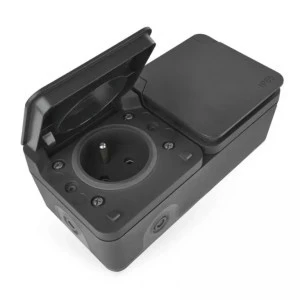 Gniazdo podwójne IP55, gniazdko podwójne ze stykami ochronnymi i osłonami przed dziećmi, typ połączenia: zacisk automatyczny, design: Cyclone, napięcie: 250 V~/16 A max., sposób montażu: na ścianę, rodzaj: podwójne wodoodporne, stopień ochrony: IP55, kolor: szary, okres gwarancyjny: 2 lata