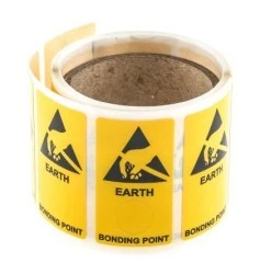 Etykiety samoprzylepnych punktów spawalniczych na Ziemi. Przeznaczony do stosowania pod kołkami na sprzęcie Zgodność z normą BS EN 61340-5-1.