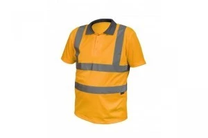 Ostrzegawcza koszulka polo. Wykonana z wysokiej jakości poliestru, który jest przewiewny i miły w dotyku. Polo z kołnierzykiem z plisą zapinaną na guziki. Luźny krój nie opina sylwetki i zapewnia pełną swobodę ruchów. Koszulka posiada 2 taśmy odblaskowe dookoła korpusu i 2 taśmy odblaskowe na ramionach, które zapewniają widoczność w niesprzyjających warunkach. Pomarańczowa odzież ochronna ma szerokie zastosowanie w transporcie drogowym, przemyśle i usługach.
