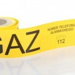 Folia żółta z nadrukiem GAZ o następujących parametrach: szerokość 20 cm, nadruk GAZ, zgodnie ze standardem ST-IGG dla gazownictwa z 2011 r. standardowy nawój 100 mb,