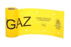 Folia żółta z nadrukiem GAZ, o następujących parametrach: szerokość 20 cm, grubość 0,3 mm, standardowy nawój 100 mb, zgodnie z obowiązującym standardem STIGG dla gazownictwa z 2015 r.