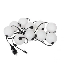 Girlanda świetlna, Długość [mm]: 6000, Barwa światła: ciepłobiała, Częstotliwość znamionowa [Hz]: 50, Długość przewodu [m]: 1, Ilość cykli wł/wył: ≥25000, Jednolitość barw [SDCM]: 6, Klasa ochronności przed porażeniem elektrycznym: II, Materiał klosza: tworzywo sztuczne, Materiał obudowy: tworzywo sztuczne, Miejsce zastosowania: wewnątrz i na zewnątrz, Minimalna odległość od oświetlanego obiektu: 0,1m, Moc maksymalna [W]: max 10, Możliwość współpracy ze ściemniaczem: nie, Napięcie znamionowe [V]: 220-240 AC, Rodzaj przyłącza: przewód zakończony wtyczką, Stopień IP: 44/67, Strumień świetlny oprawy [lm]: 10 x max 35, Temperatura barwowa [K]: 2500, Współczynnik oddawania barw Ra: 80, Zakres temperatury otoczenia, na którą może być narażony wyrób [°C]: -20÷40, Zasilacz w komplecie: tak, Użyteczny strumień świetlny źródła światła Φuse [lm]: 72, Użyteczny strumień świetlny źródła światła Φuse [lm]: w kuli (360°).