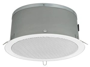 Głośnik sufitowy PA posiadający certyfikat EN 54-24. · Technika 100V, 3 odczepy mocy · Głośnik pełnopasmowy o wysokiej efektywności · Metalowa obudowa · Pokrywa ochronna przeciwogniowa · Szybki montaż · Odporny na uderzenia piłką, zgodnie z normą DIN 18032, część 3 Technika 100 V Pasmo przenoszenia 70-19 000Hz Moc znamionowa RMS 6/3/1.5 W Skuteczność 98 dB (1 W/1 m) 81 dB (EN, 1 W/4 m) Max SPL 106 dB (1 m) 90 dB (EN, 4 m) Kąt promieniowania w poziomie 180° (500 Hz) 180° (1 kHz) 90° (2 kHz) 49° (4 kHz) Kąt promieniowania w pionie 180° (500 Hz) 180° (1 kHz) 90° (2 kHz) 49° (4 kHz) Otwór montażowy Ø 230 mm Głębokość montażowa 110 mm Wymiary Ø 252mm x 110mm Średnica zewnętrzna Ø 252 mm Szerokość Ø 252 mm Wysokość Ø 252 mm Głębokość 110 mm Kolor biały Dopuszcz. temp. otoczenia 0-40 °C Waga 1.8 kg Ilość 1 Typ głośnika 200 Wymiary opakowania (S x W x D) 0.28 x 0.13 x 0.28 m Waga brutto 2.005 kg Waga netto 1.81 kg