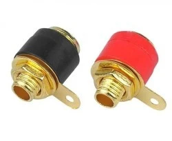 Wysokiej jakości gniazda montażowe banan w kolorze czarnym oraz czerwonym służące do łączenia rozmaitych urządzeń przy pomocy przewodów.