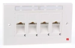 CAT 5e - płyty czołowe. Płyty czołowe z gniazdami RJ45 kategorii 5e z nachylonym otworem zapewniają bezpieczniejszy i łatwiejszy dostęp do ołowiu (mniej podatny na uszkodzenia). Końcówki zaciskowe niskoprofilowe do zagniatania tyłu akceptują przewody w zakresie od 22 do 28 awg. Do zakańczania przewodów użyć wciskarki, patrz wciskanie narzędzia IDC. Zakończenia są oznaczone kolorami zgodnie ze specyfikacją okablowania T568B. Zaprojektowane w wersji z jednym, dwoma i czterema gniazdami, z etykietami identyfikacyjnymi i śrubami mocującymi