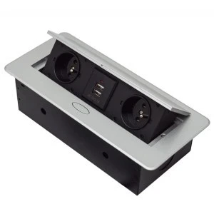Ten zestaw zawiera dwa uziemione gniazda sieciowe i dwa gniazda ładowania USB w zwartej metalowej, otwieranej obudowie.