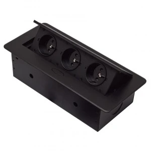 Ten zestaw zawiera trzy uziemione gniazda sieciowe w zwartej metalowej, otwieranej obudowie.