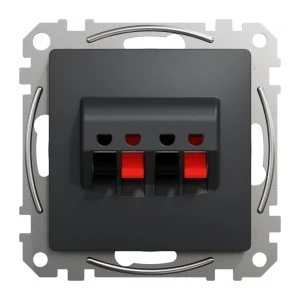 Gniazdo głośnikowe podwójne, czarny antracyt, to osprzęt serii Sedna Design & Elements marki Schneider Electric. Gniazdo głośnikowe podwójne ma malowane wykończenie powierzchni w kolorze czarnego antracytu i posiada następujące wymiary: szerokość 73 mm, wysokość 73 mm, głębokość 52 mm, głębokość wystawania 31 mm. Długość izolacji zdejmowanej z kabla to 7 mm. Gniazdo charakteryzuje się stopniem ochrony IP20. Do produkcji gniazda wykorzystano tworzywo termoplastyczne o zwiększonej odporności na promieniowanie UV. Produkt jest montowany podtynkowo i posiada zaciski bezśrubowe. Uwaga: produkty Sedna Design & Elements nie są kompatybilne z serią Sedna!