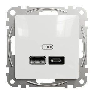 Gniazdo ładowania USB typ A+C 2,4A, białe, to osprzęt serii Sedna Design & Elements marki Schneider Electric. Gniazdo ładowania USB ma lśniące wykończenie powierzchni w kolorze białym i posiada następujące wymiary: szerokość 73 mm, wysokość 73 mm, głębokość 43 mm, głębo kość wystawania 12 mm. Długość izolacji zdejmowanej z kabla to 8 mm. Gniazdo charakteryzuje się stopniem ochrony IP20. Do produkcji gniazda wykorzystano tworzywo termoplastyczne o zwiększonej odporności na promieniowanie UV. Produkt jest montowany podtynkowo. Uwaga: pro dukty Sedna Design & Elements nie są kompatybilne z serią Sedna!