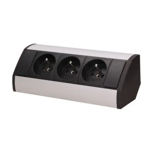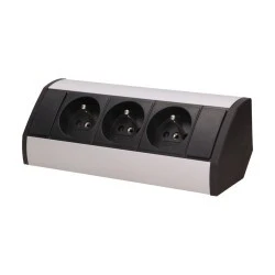 Zestaw trzech gniazd sieciowych z uziemieniem i przesłonami torów prądowych, idealne, do montażu w szafkach, gablotach i witrynach.