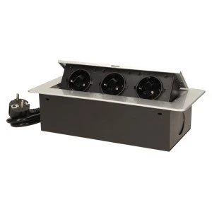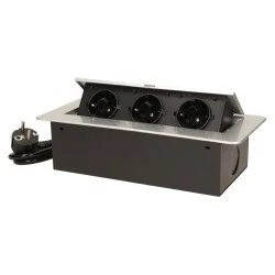 Zestaw trzech gniazd sieciowych z uziemieniem i przesłonami torów prądowych w obudowie chowanej w blat. Urządzenie przeznaczone jest do montażu w biurkach, blatach i stołach, może być zamontowane zarówno w pozycji pionowej jak i poziomej, zapewniając dostęp do gniazd elektrycznych. Posiada zamykany panel z gniazdami sieciowymi oraz przewód o długości 1,5 m. Dostępne kolory: czarny, srebrny, złoty, mosiądz, grafit.