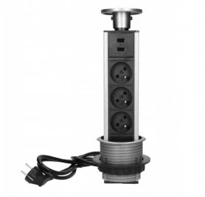 Zestaw dwóch wyjść USB-A oraz trzech gniazd sieciowych 230 V typu francuskiego z uziemieniem, w maskownicy wsuwanej w blat.