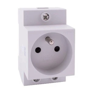 Gniazdo z uziemieniem przeznaczone do montażu na szynie TH35. Urządzenie może pełnić rolę gniazda serwisowego w rozdzielni elektrycznej.
