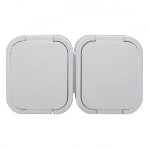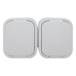 Podwójne gniazdo bryzgoszczelne z klapką, typu francuskiego, natynkowe 2x2P+Z. Sprawdzi się wszędzie tam, gdzie konieczna jest ochrona przed kurzem i strugami wody (IP54).
