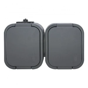 Podwójne gniazdo bryzgoszczelne z klapką, typu francuskiego, natynkowe 2x2P+Z. Sprawdzi się wszędzie tam, gdzie konieczna jest ochrona przed kurzem i strugami wody (IP54).