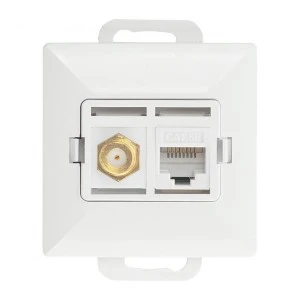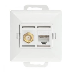 Zestaw gniazd: gniazdo antenowe, typu F. Umożliwia podłączenie jednego przewodu ze złączem typu F. Gniazdo komputerowe RJ45, nieekranowane Cat6. Przystosowane do montażu podtynkowego. Należy stosować wewnątrz pomieszczeń (IP20).