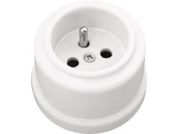 Gniazdo pojedyncze z uziemieniem (2P + Z typ – E/french). Konstrukcja gniazda uniemożliwia dzieciom wsunięcie przedmiotów do ich wnętrza, zapobiegając tym samym porażenia prądem. W mechanizmie gniazda zamontowana jest przesłona uchylająca się pod jednoczesnym naciskiem obu bolców wtyczki. Przeznaczone jest do montażu w puszcze podtynkowej, o średnicy 60 mm. Części zewnętrzne wykonane z ceramiki w białym kolorze o lśniącej powierzchni. Kompatybilny z ramkami drewnianymi oraz ceramicznymi z serii Ceramic.