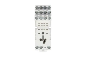 Gniazdo wtykowe w kolorze szarym stanowiące element wyposażenia przekaźnika przemysłowego. Szerokość gniazda wynosi 27 mm, głębokość 61 mm, a wysokość 75 mm. Gniazdo przystosowane jest do montażu na szynie DIN 35 mm lub na płycie montażowej za pomocą odpowiednich wkrętów. W gniazdach tego typu można instalować moduły typu M.