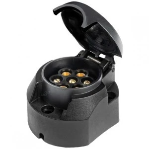 Uniwersalne gniazdo 7-pinowe przeznaczone do podłączenia i zasilania instalacji elektrycznej 12 oraz 24V w przyczepach, przyczepkach, lawetach i innych pojazdach.
