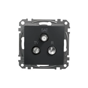 Gniazdo R/TV/SAT przelotowe (10dB), czarny antracyt, to osprzęt serii Sedna Design & Elements marki Schneider Electric. Gniazdo R/TV/SAT przelotowe (10dB) ma malowane wykończenie powierzchni w kolorze czarnego antracytu i posiada następujące wymiary: szerokość 73 mm, wy sokość 73 mm, głębokość 41 mm, głębokość wystawania 17.4 mm. Gniazdo charakteryzuje się stopniem ochrony IP20. Do produkcji gniazda wykorzystano tworzywo termoplastyczne o zwiększonej odporności na promieniowanie UV. Produkt jest montowany podtynkowo. Uwaga: produkty Se dna Design & Elements nie są kompatybilne z serią Sedna!