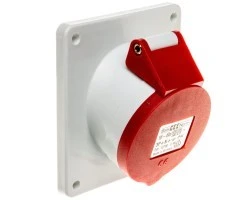 Gniazdo tablicowe Quick-Connect skośne 16A 3P+N+PE 200/346 do 240/415V 6h IP44 50 i 60Hz, Kołnierz i otwory montażowe: kołnierz 100x92 Otwory motażowe 85x77, Kolor indentyfikacyjny: czerwony RAL 3000, Izolator/Kontakty: Izolator z PA6 kontakty mosiężne, Przewód mm2 max 4,0 mm2, Obudowa PA6 RAL 7035 poliamid, materiał uszczelek: uszczelka kołnierzaTPE biała, elementy zewnętrzne elementy metalowe sprężyna klapki stal nierdzewna nity klapki mosiężny, Inne: skośne 20° klapka samozamykająca