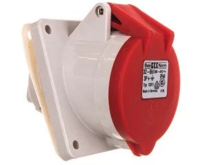 Gniazdo tablicowe skośne 32A 3P+PE 380 do 415V 6h IP44 50 i 60Hz, Kołnierz i otwory montażowe: kołnierz 85x85 Otwory motażowe 70x70, Kolor indentyfikacyjny: czerwony RAL 3000, Izolator/Kontakty: Izolator z PA6 kontakty mosiężne, Przewód mm2 max 10,0 mm2, Obudowa PA6 RAL 7035 poliamid, materiał uszczelek: uszczelka kołnierzaTPE biała, elementy zewnętrzne elementy metalowe Inne: skośne 20° klapka samozamykająca