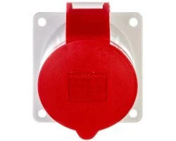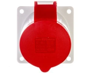 Gniazdo tablicowe skośne 32A 3P+N+PE 200/346 do 240/415V 6h IP44 50 i 60Hz, Kołnierz i otwory montażowe: kołnierz 85x85 Otwory motażowe 70x70, Kolor indentyfikacyjny: czerwony RAL 3000, Izolator/Kontakty: Izolator z PA6 kontakty mosiężne, Przewód mm2 max 10,0 mm2, Obudowa PA6 RAL 7035 poliamid, materiał uszczelek: uszczelka kołnierzaTPE biała, elementy zewnętrzne elementy metalowe sprężyna klapki stal nierdzewna nity klapki mosiężny, Inne: skośne 20° klapka samozamykająca