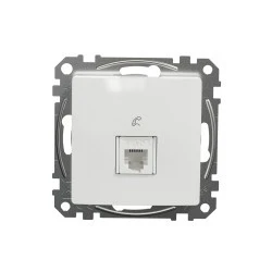 Gniazdo telefoniczne RJ11, białe, to osprzęt serii Sedna Design & Elements marki Schneider Electric. Gniazdo telefoniczne ma lśniące wykończenie powierzchni w kolorze białym i posiada następujące wymiary: szerokość 73 mm, wysokość 73 mm, głębokość 35 mm, głębokość wysta wania 13 mm. Gniazdo charakteryzuje się stopniem ochrony IP20. Do produkcji gniazda wykorzystano tworzywo termoplastyczne o zwiększonej odporności na promieniowanie UV. Produkt jest montowany podtynkowo. Uwaga: produkty Sedna Design & Elements nie są kompatybilne z seri ą Sedna!